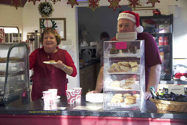 At Staverton the cafe coach was open and did a good trade, although it was declared a “turkey-free zone” No matter: the pasties and drinks were great, and the mince pies and clotted cream to die for. Again, a great credit to all the station’s volunteers. Sue and Steve Bates are in the photo, but several other staff were on duty.