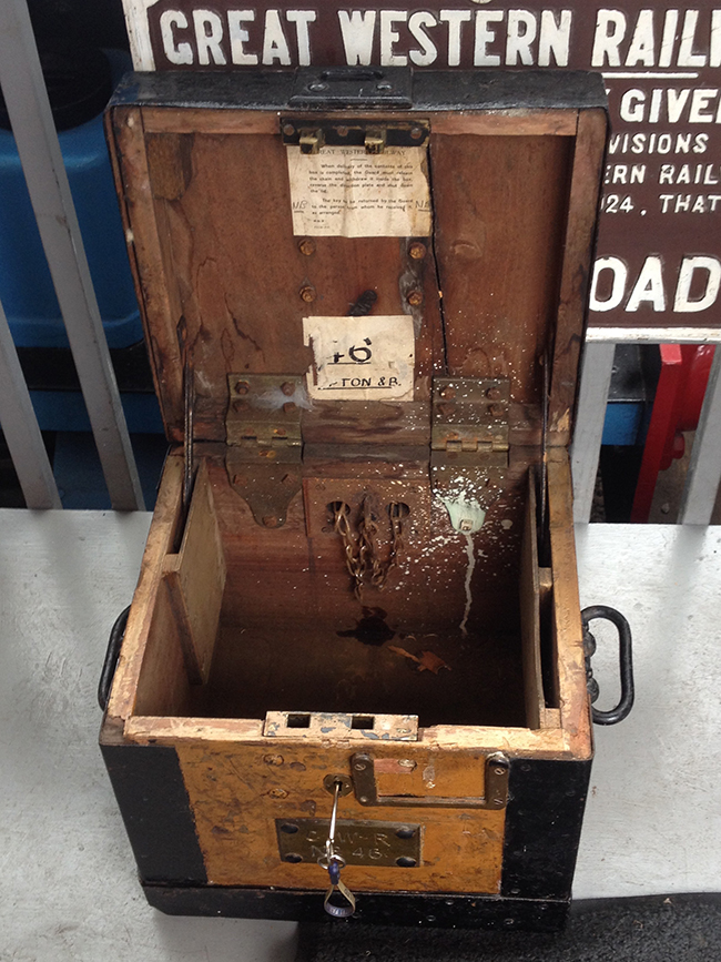 For years the SDRT Museum has had a GWR travelling safe in its collection. Thanks to Kelvin “Fingers” Ellis, with some assistance from SDR Engineering, the safe has been unlocked. It is NO 46, and its home base was originally Upton & Blewbury, first station south of Didcot on the Didcot, Newbury and Southampton line. It can still be chained up for security to e.g. the handbrake column in a guard’s compartment.